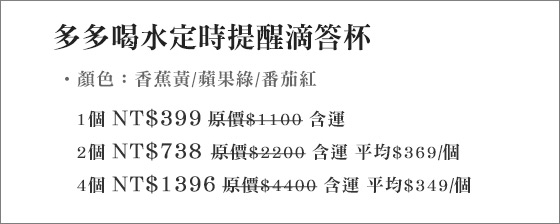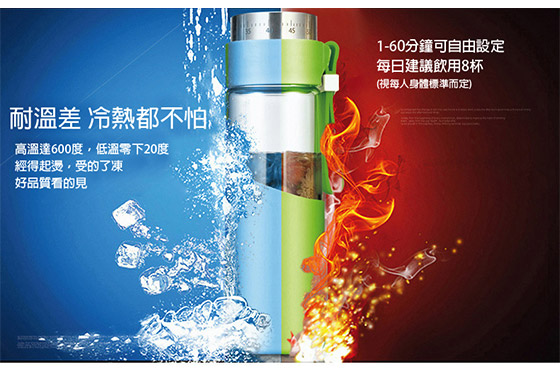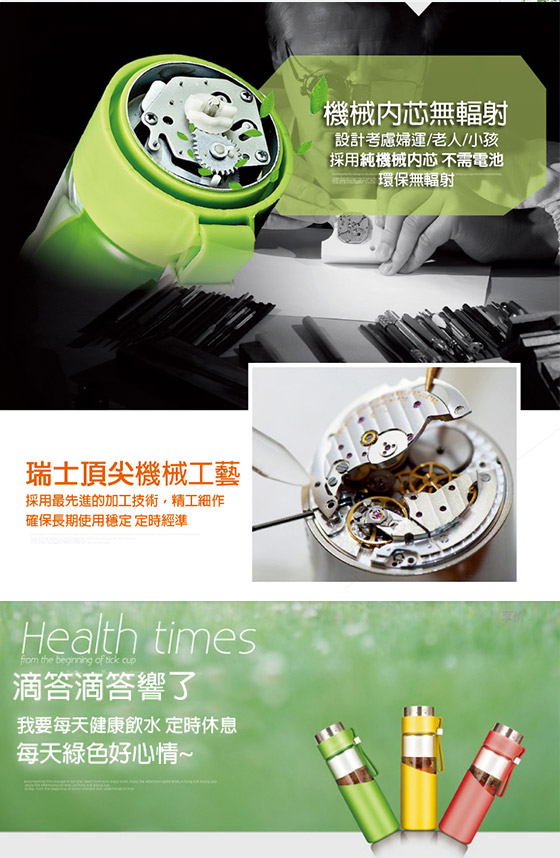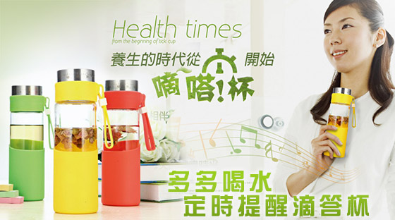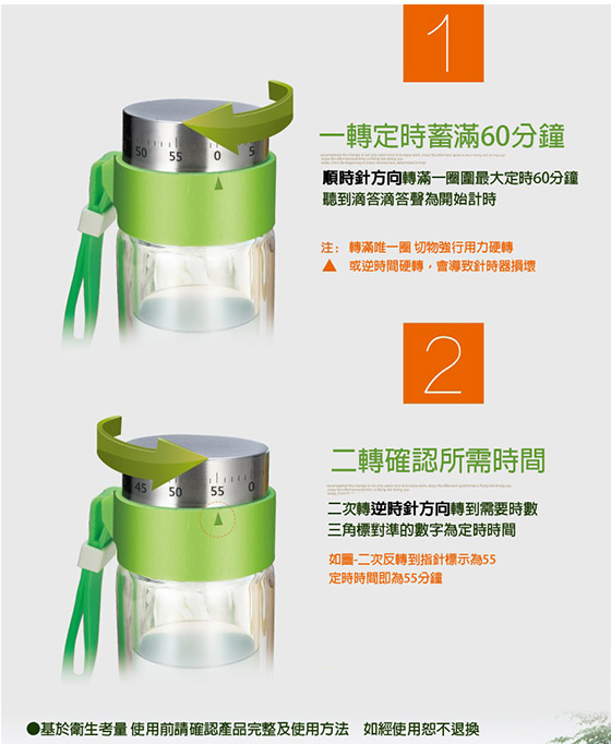 順時針轉滿能定時60分鐘,滴答滴答時間到就會發出聲響,提醒忙碌的你喝水,維持身體內的水分,精神更好更加倍。
